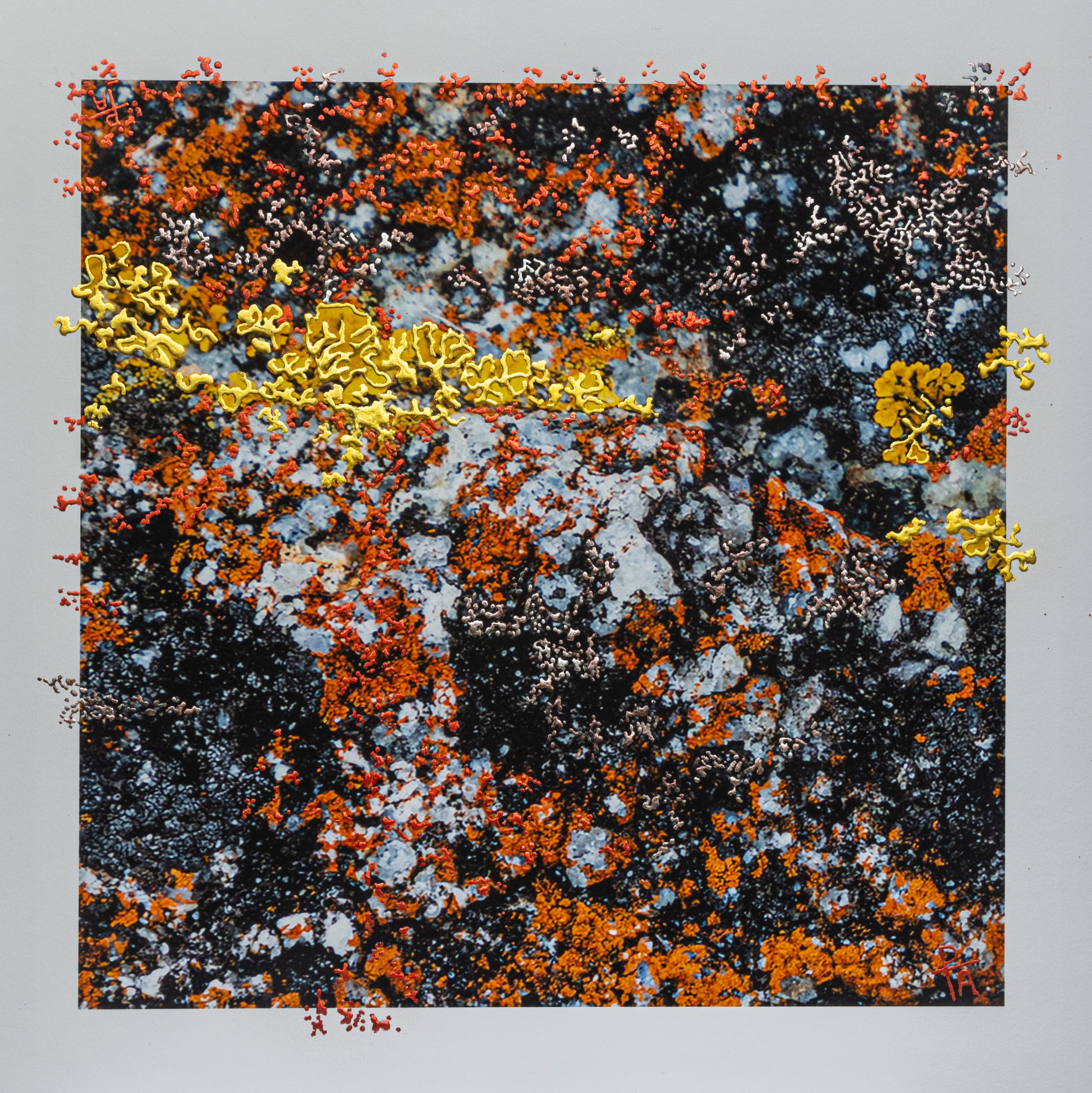Deep reds, soft greys, and vibrant yellow accents create a subtle movement across the artwork, echoing flames rising from stone.