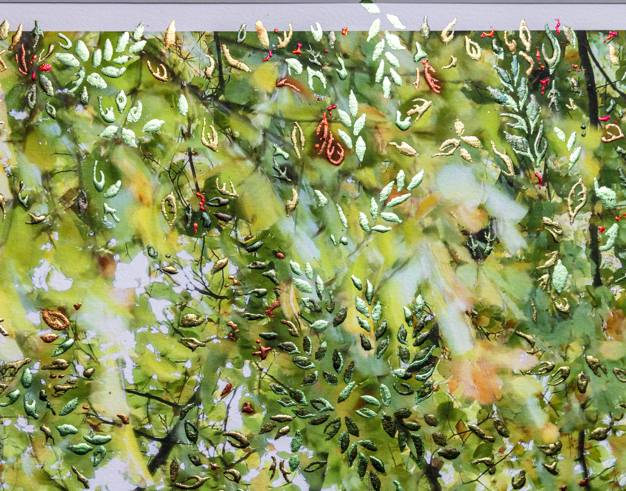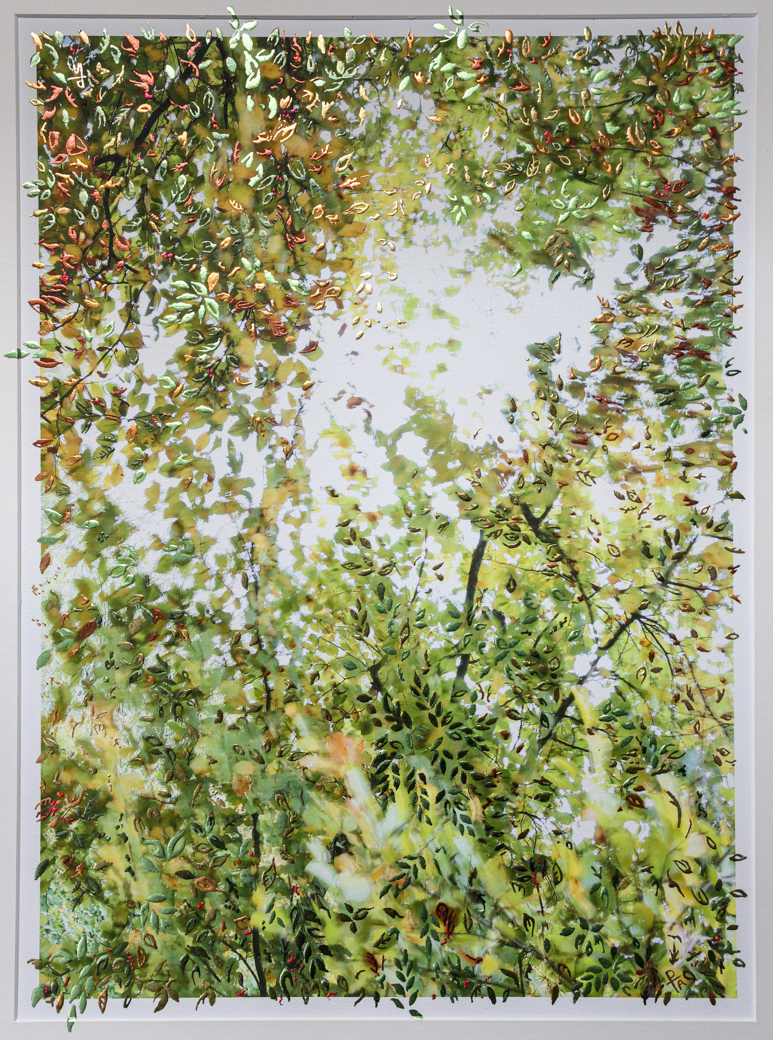 A luminous mixed-media artwork inspired by looking up through a canopy of leaves, gilded with multi-tonal silver and metal leaf.