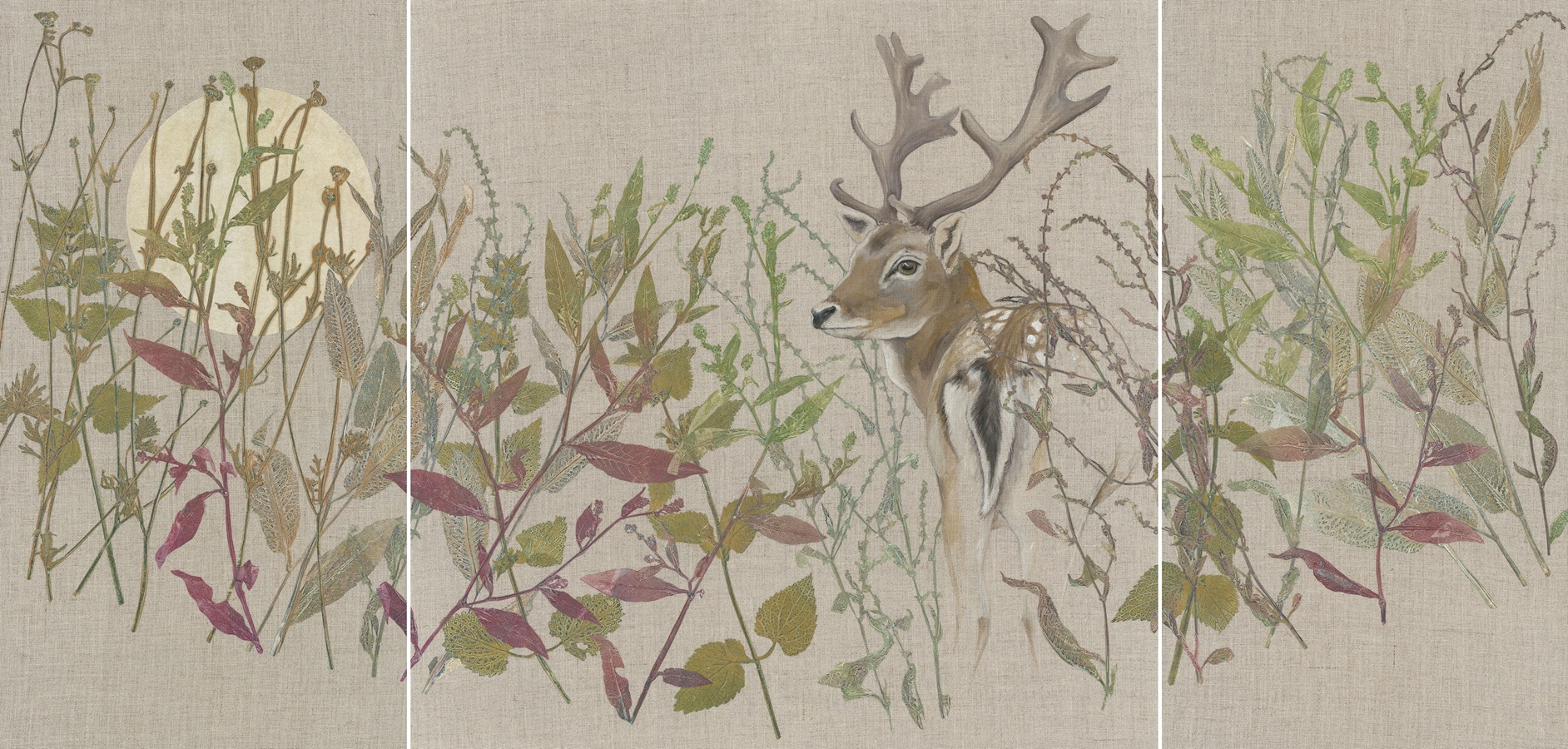 By The Light Of The Buck Moon is a captivating triptych by Kent-based artist, Jade Taylor, combining acrylic on linen with delicate botanical monoprint collage.