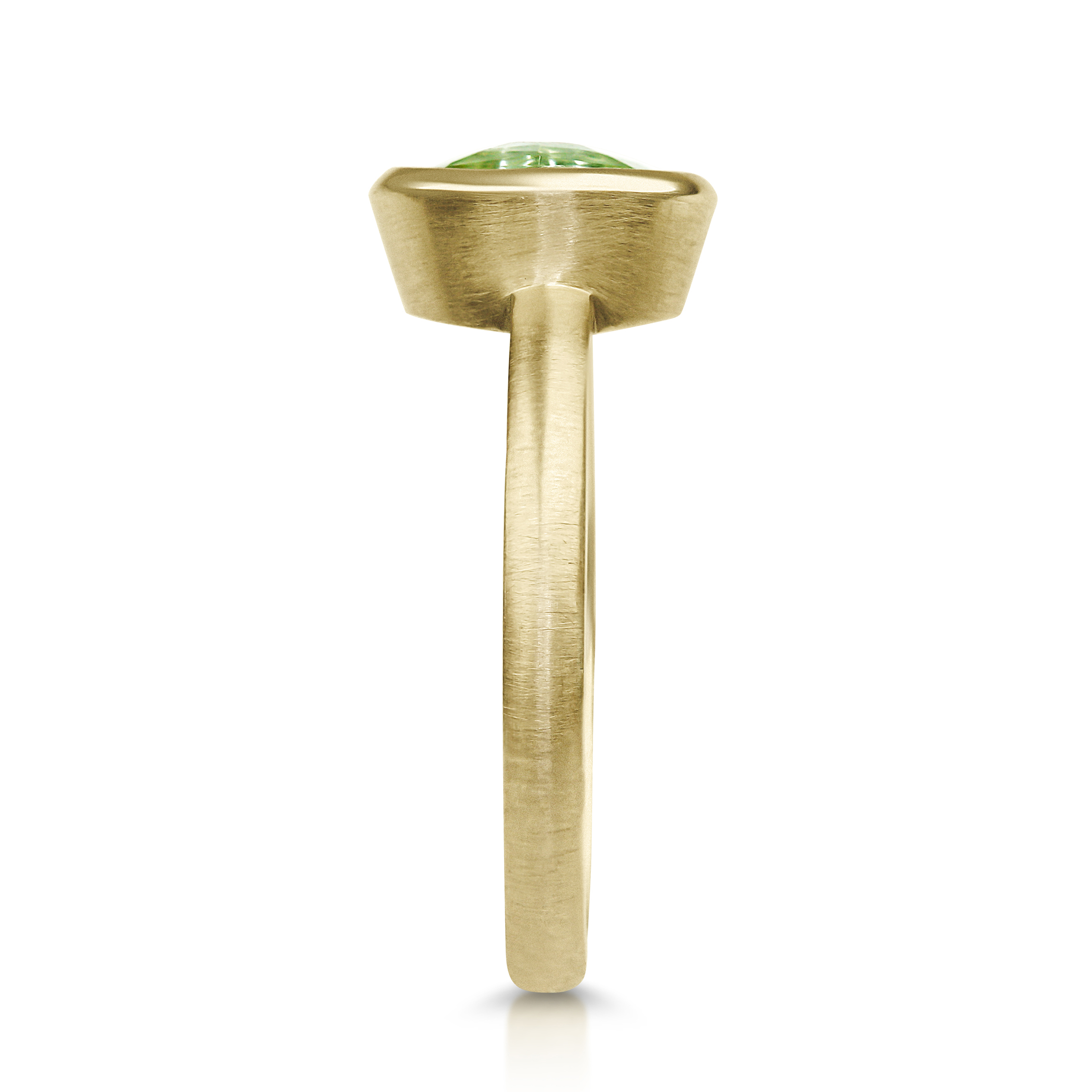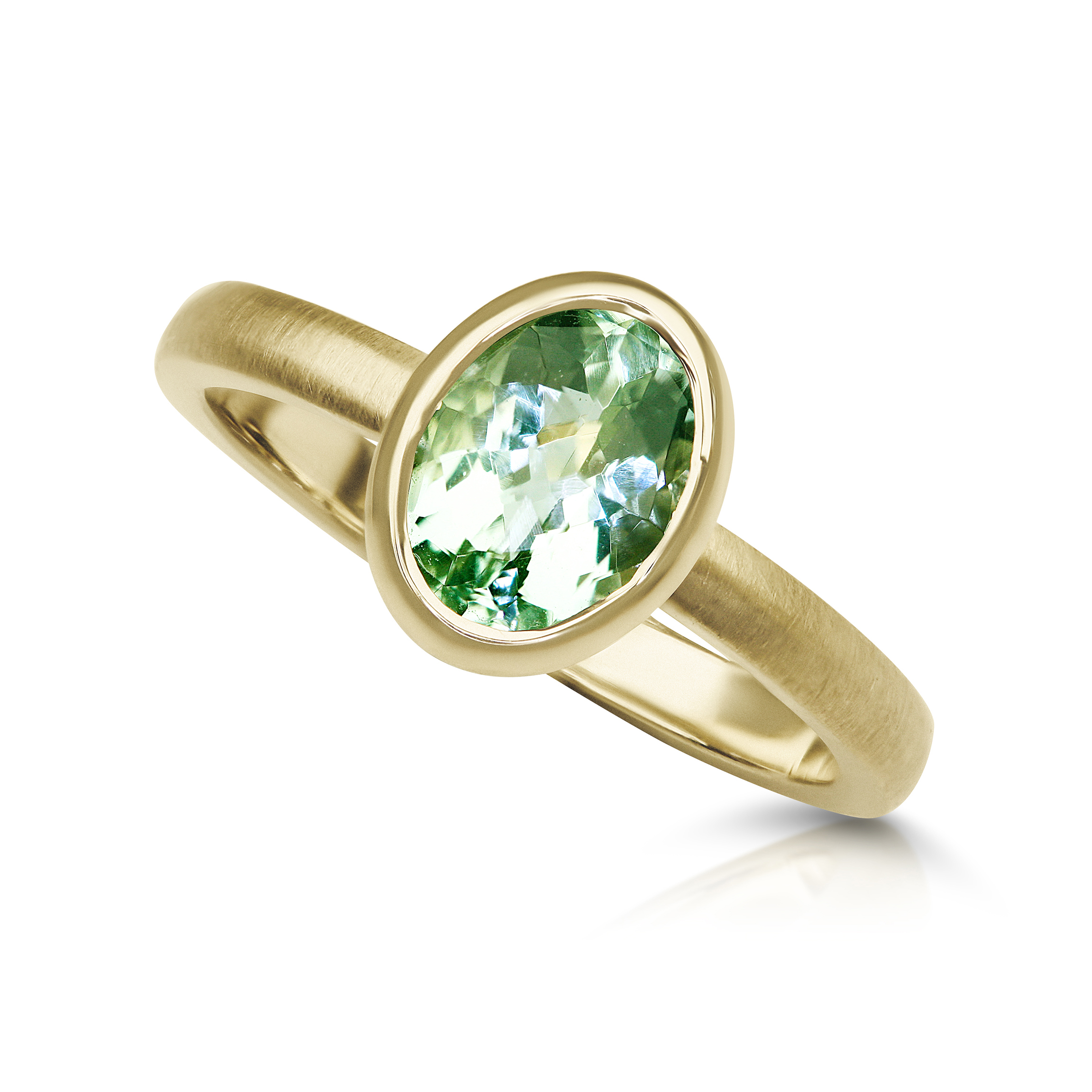 The Helios Ring pairs a glowing oval Green Beryl with matte recycled 9ct yellow gold