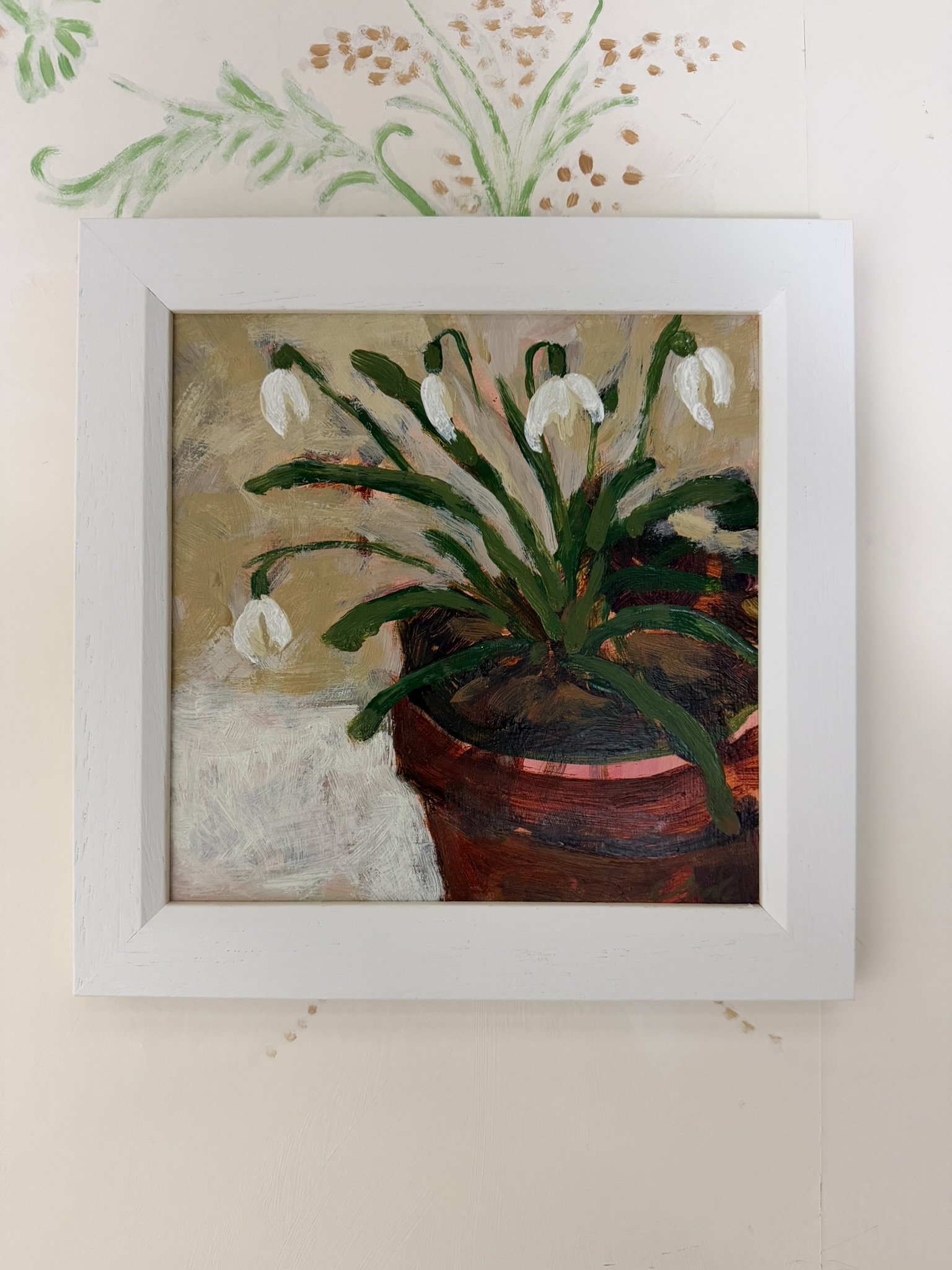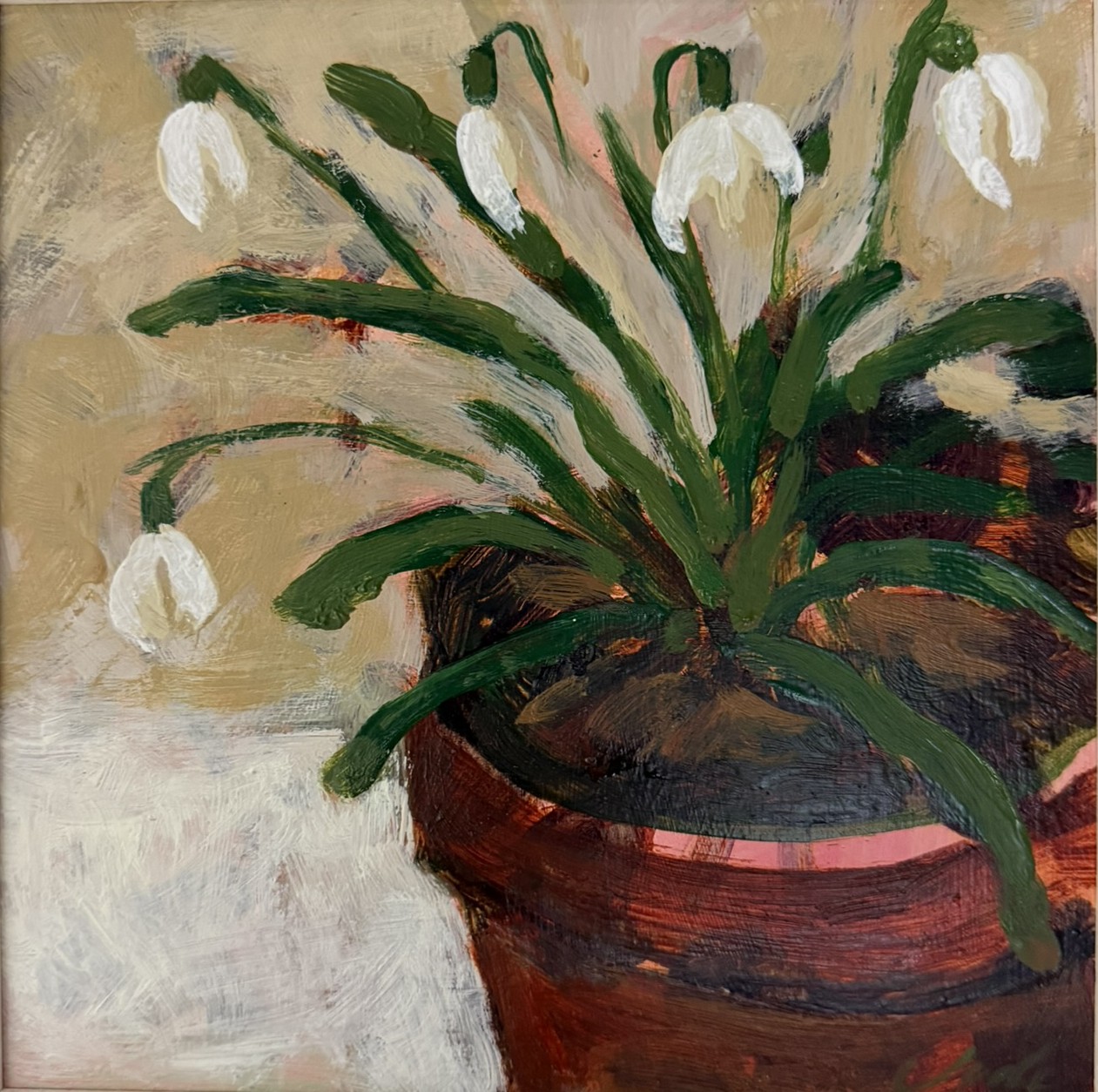Snowdrops is a small, quietly beautiful original oil painting by Jude Askey-Brown, capturing the first delicate signs of the season ahead. A simple terracotta pot holds early snowdrops, painted with expressive yet gentle brushwork that emphasises their fragile elegance.