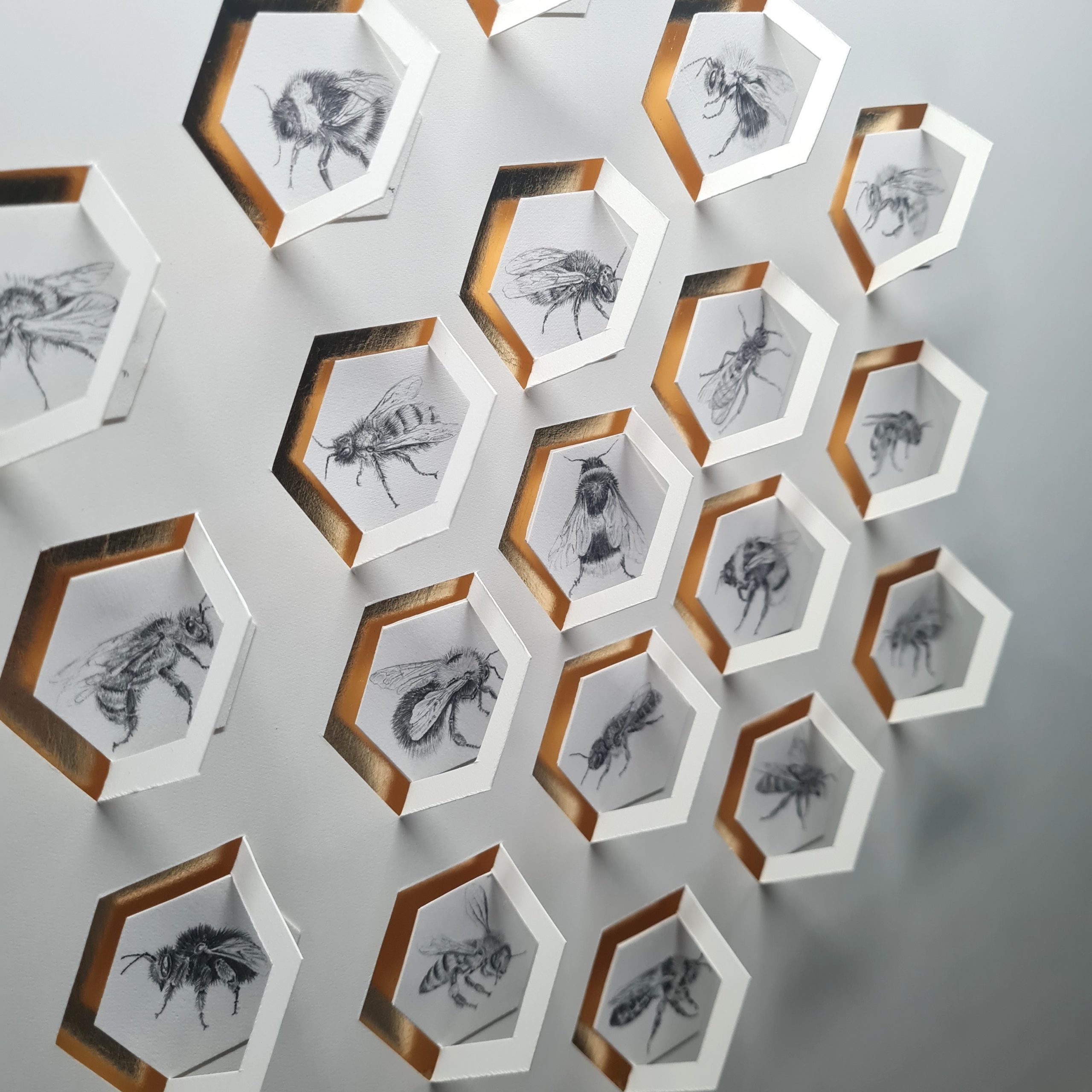 Each tiny bee is drawn under magnification for absolute precision. The hexagonal motifs symbolising the structure and harmony within bee communities. This piece draws us in to the detail, while also being modern statement. The scultural folds within the art creating play of light and shadow.